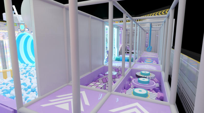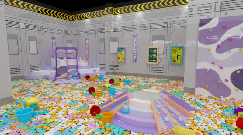Dive into a rainbow pebble pit (with buckets and shovels for epic sand-style adventures), zip down sleek slides, scale the whimsical purple climbing wall, and explore colorful activity panels. Whether you’re racing up the pastel steps or letting your imagination run wild with playful props, every corner sparkles with cosmic charm.