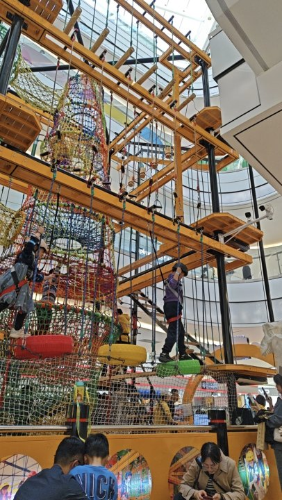 Unleash your child's courage and adventure spirit at our indoor rope course! Nestled in the mall, this multi-level playground features colorful nets, challenging obstacles, and secure harnesses. It's not just a game, but a journey to build confidence, coordination, and teamwork. Watch your kids conquer heights, navigate through fun challenges, and create unforgettable memories. Let them explore, learn, and grow in this exciting world of adventure! Come and let the adventure begin!