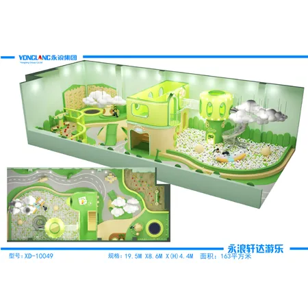 This indoor playground is a green paradise . The dominant color is a fresh and vibrant green, creating a natural and lively atmosphere. The structure is built with a galvanized steel frame, ensuring stability and durability. The play equipment, including slides and climbing structures, is made of LLDPE, known for its smooth surface and long-lasting quality. The playground is full of fun, with a ball pit filled with soft, white orbs that kids can dive into and play in. Children can also climb the climbing walls to challenge themselves and then slide down the slides for an exciting descent. There are also interactive play areas with puzzles and games designed to stimulate creativity and physical activity. Safety is a top priority, with soft padding and rounded edges on all equipment to prevent injuries. This playground is an ideal space for children to explore, play, and develop their motor skills in a safe and enjoyable environment.