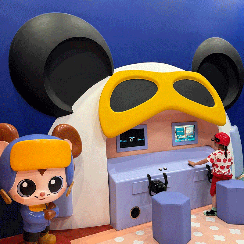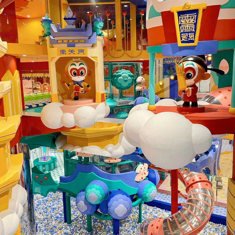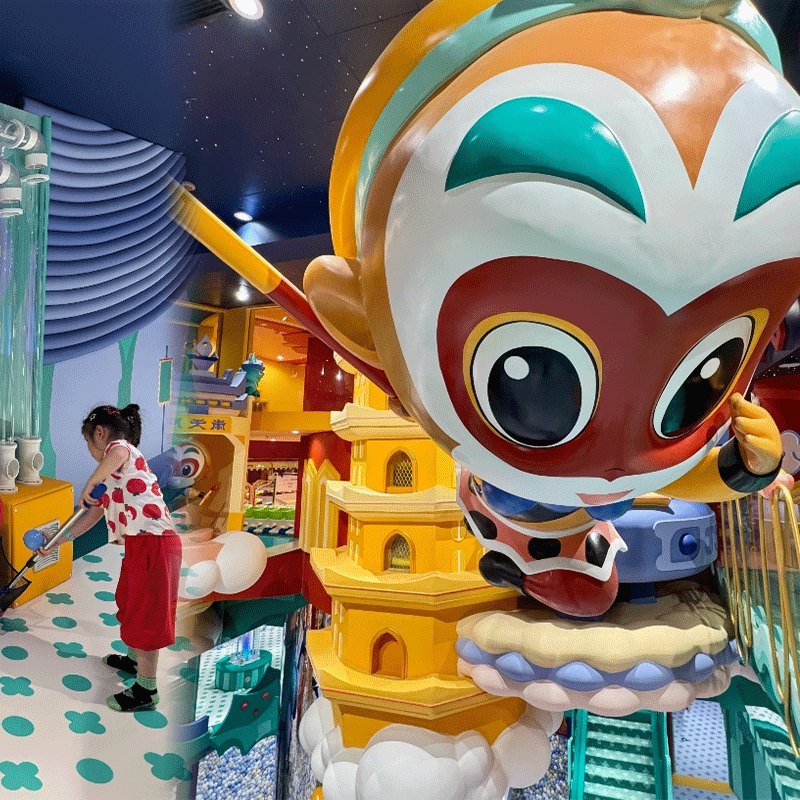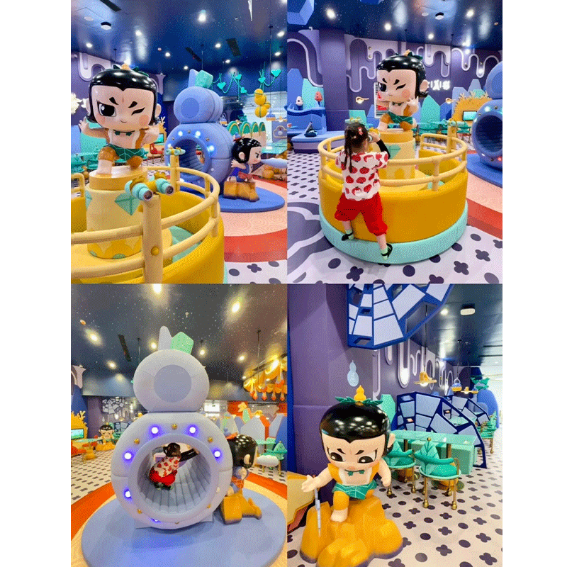The New Shanghai Cartoon Theme Indoor Playground, featuring groundbreaking immersive space brings to life legendary Shanghai Animation Film Studio IPs through interactive scenes. This indoor playground recreates Chinese animation classics, such as Calabash Brothers, Havoc in Heaven, Black Cat Detective and Nezha Conquers the Dragon King. There are various fun activities and play areas. A ball pit is filled with colorful balls, a tall, pink, spiral slide, and multiple levels with various play structures. Kids can play with toy kitchen appliances at a red and yellow play counter. This area simulates the interesting scenes of collecting fish, crabs and shrimp by the seaside. Parents with children are able to enjoy a carousel ride. For more fun, kids can operate a machine with a conveyor belt that transports pink peach-shaped plush toys. There are also pretend-grocery stalls. Rich and interesting themes and a wide variety of activities attract families to come.