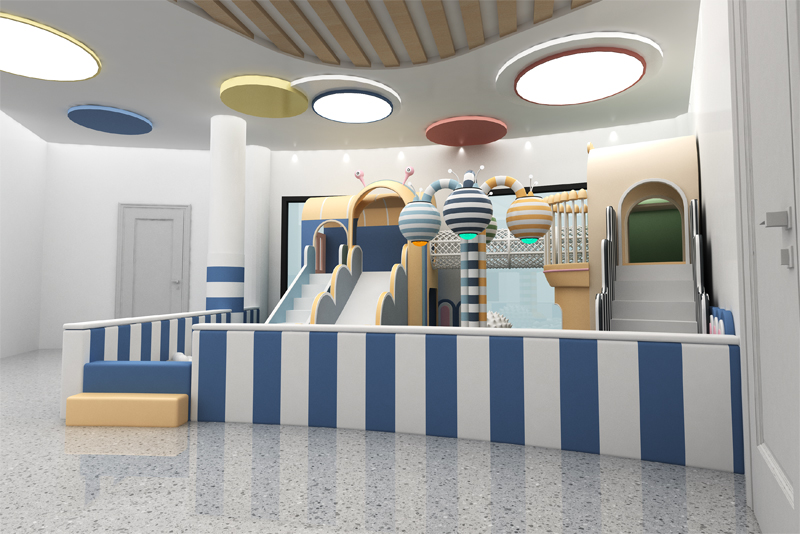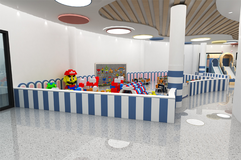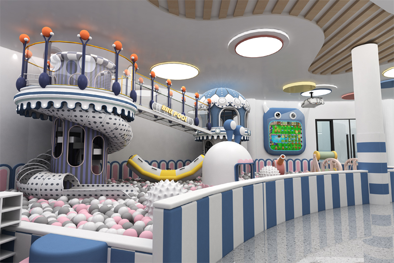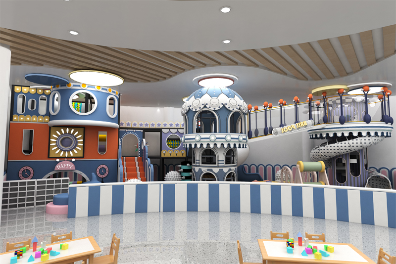 This vibrant play space blends soft pastels with bold blue accents, featuring a towering multi-level play structure , a sea of squishy ball pits, and interactive game stations that spark joy. Safety meets fun with rounded edges and cozy, padded zones, while whimsical details (like the "SHIP'S BRIDGE" walkway!) turn playtime into a magical journey.